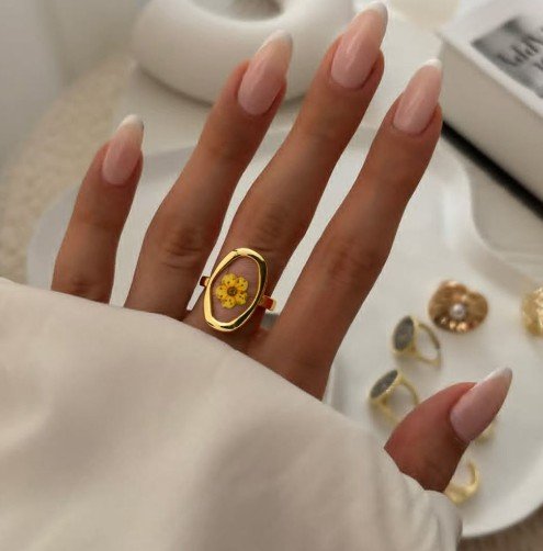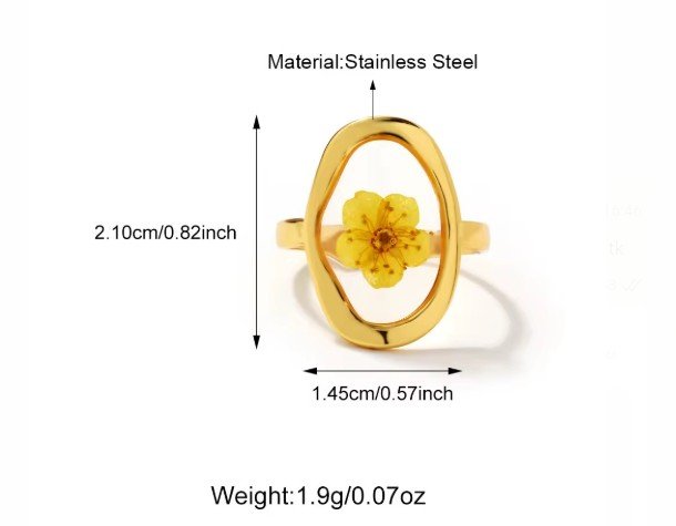The Bloom Memory Ring is crafted with a smooth, polished gold-tone band and an oval centerpiece that highlights the preserved flower in its pure form. The transparent finish allows the floral details to shine clearly, creating a soft yet eye-catching look.
